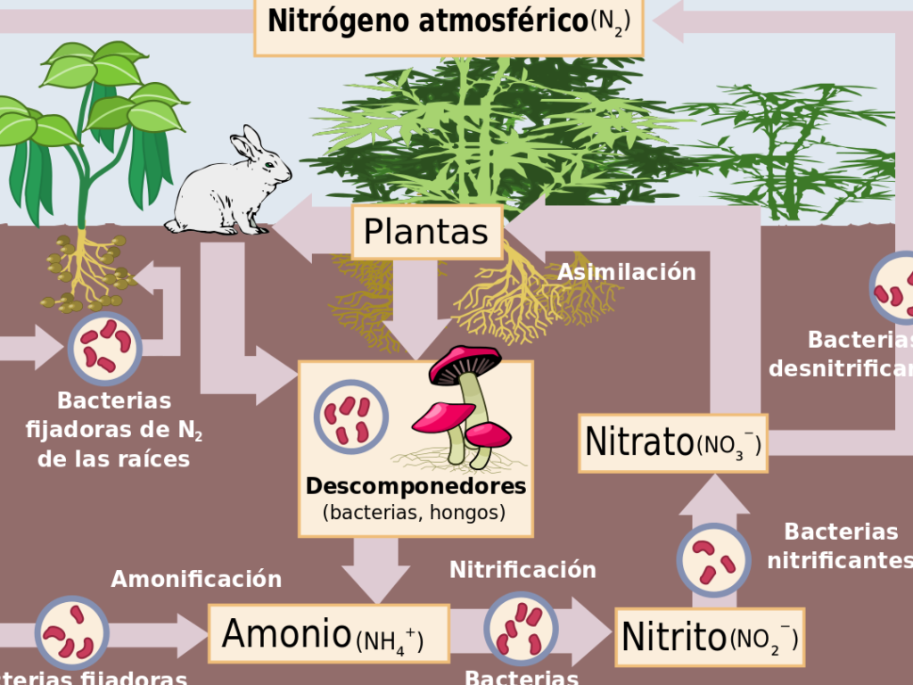 * Las bacterias desnitrificantes convierten los nitratos en nitrógeno gaseoso, liberándolo a la atmósfera.