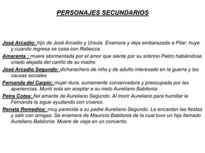 Entre los personajes secundarios más destacados se encuentran: Pietro Crespi, un joven italiano que llega a Macondo y se enamora de Úrsula Iguarán; Rebeca Buendía, la hermana adoptiva de José Arcadio Buendía; Aureliano Buendía, el coronel que lucha en la guerra civil; y Amaranta Úrsula, la hija de Aureliano y Remedios Moscote.