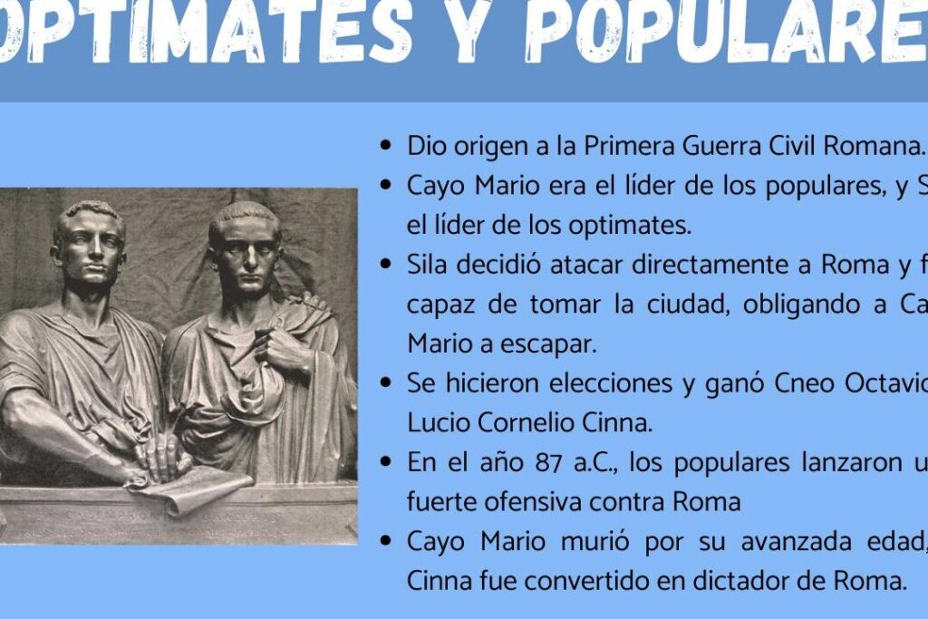 Los populares y optimates eran dos facciones políticas enfrentadas en la antigua Roma durante la República tardía. Ambas facciones competían por el poder y el control del gobierno.